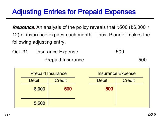 As prepaid insurance is an asset that will expire through the passage of time the cost of expiration will need to be recognized as an expense during the period. Prepaid Insurance Dr 10000 Bank Cr 10000 Every Month End Insurance Dr 834 Prepaid Insurance 834.